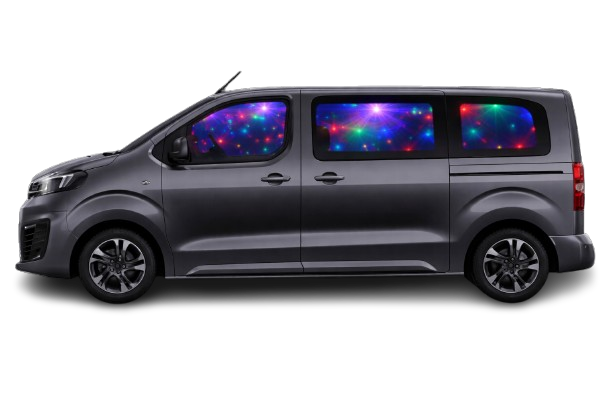 Our 8 seater party bus features disco balls, LED mood lighting, a powerful sound system with subwoofer and Bluetooth connectivity, so you can bring the party with you wherever you are going.